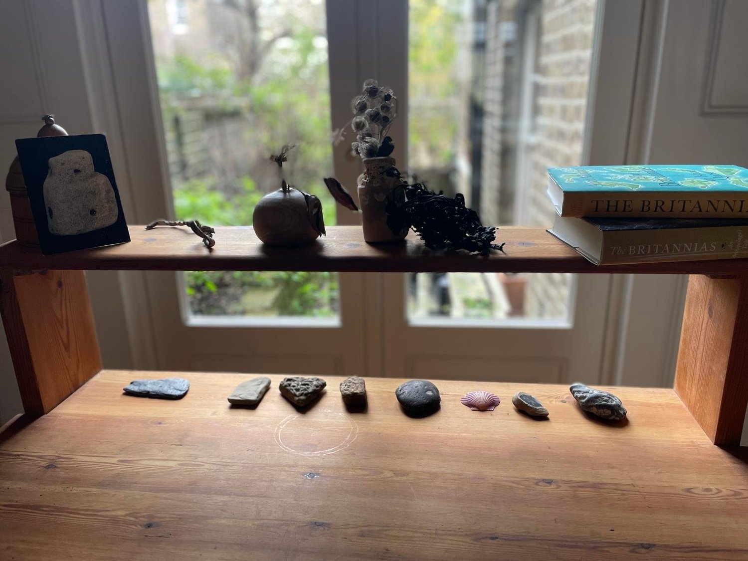 Alice Albinia made this pine desk on which she wrote The Britannias when she was 12 for a design project at school. She 'spent ages sanding it'. On the desk is Orkney flotsam and jetsam picked up when she was living there to research the book, which is shortlisted for the 2024 Edward Stanford Travel Book of the Year(announced tonight) and longlisted for the inaugural Women's Prize for Non-Fiction.