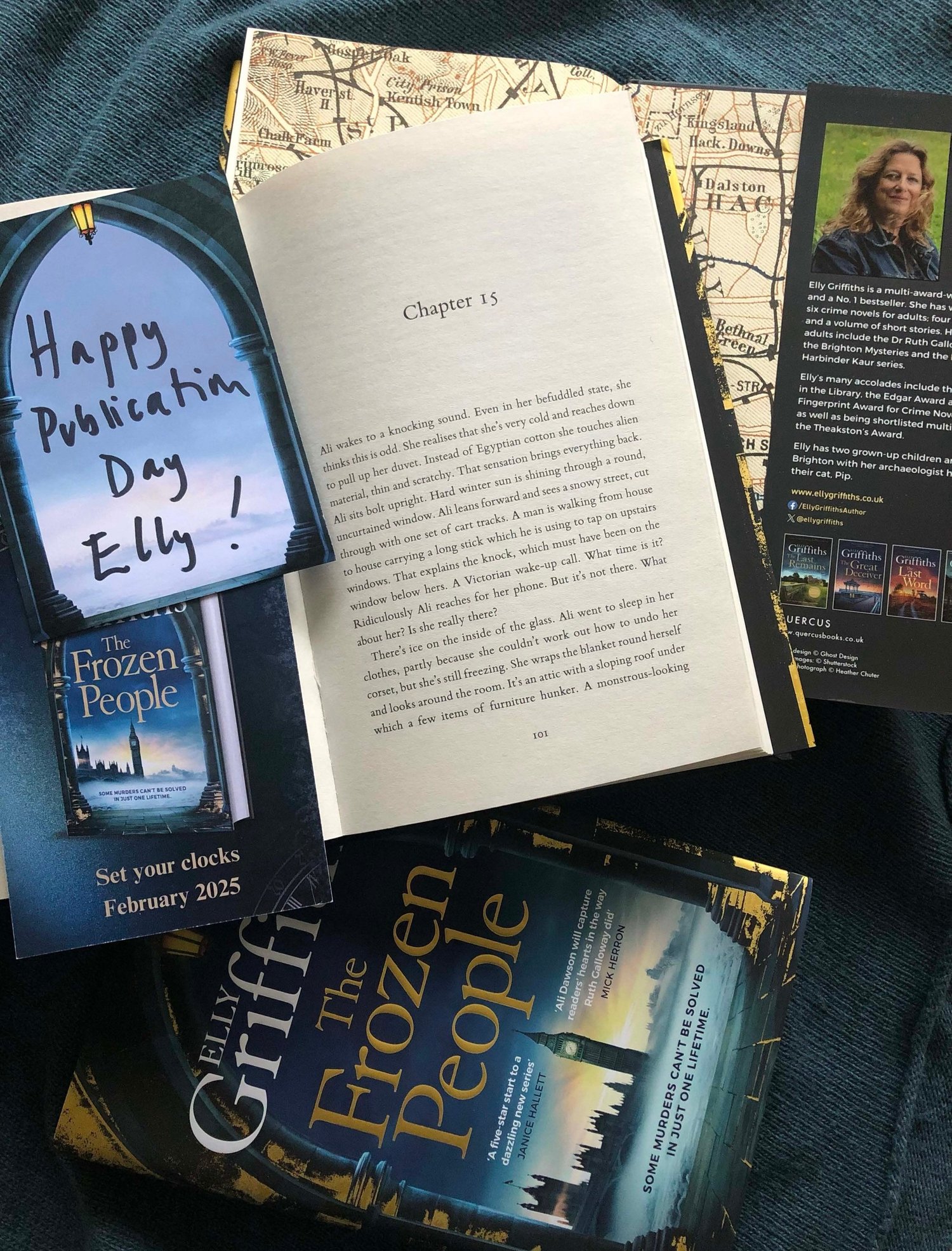 The Frozen People, the first in a new series by Elly Griffiths featuring time-travelling detective Ali Dawson, was launched on 13 February with a party at Goldsboro Books in Cecil Court, London, kicking off a two-week tour around the UK.